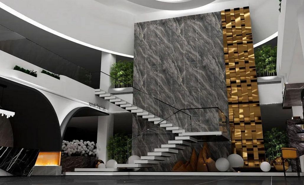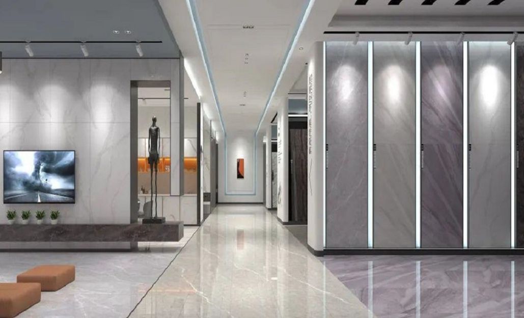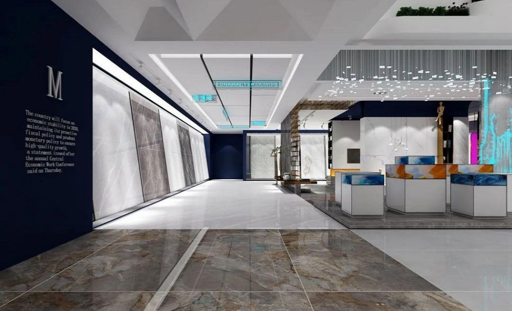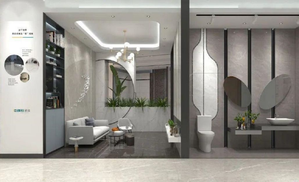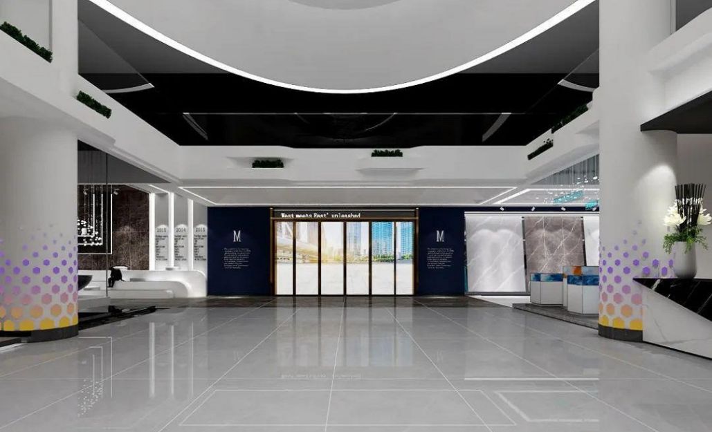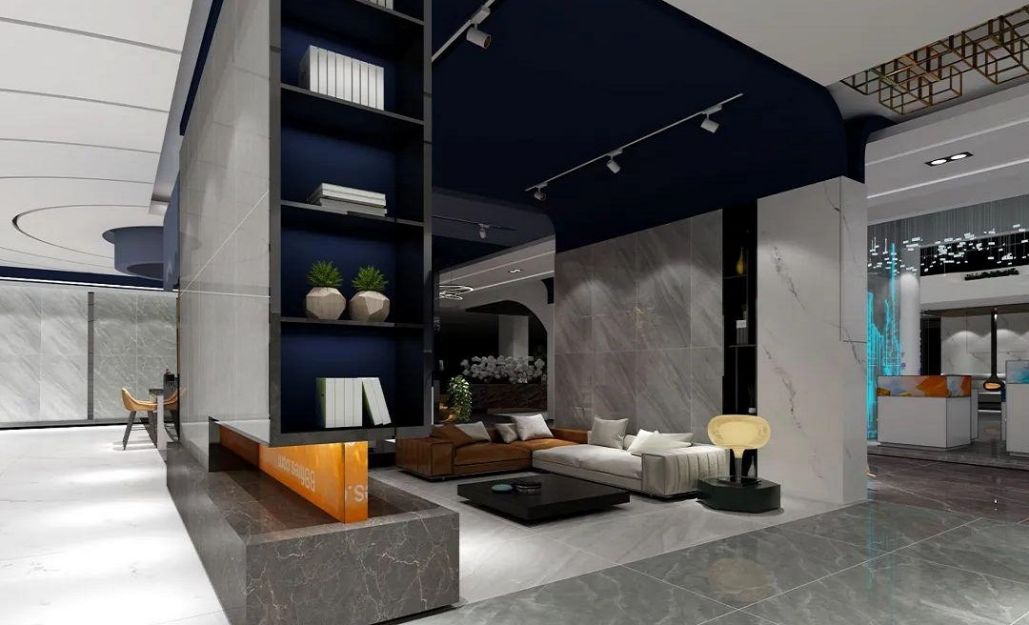 設(shè)計(jì)思路:展廳整體以銀白色為主色調(diào),通過(guò)大面積的銀白色墻面、地面和展示架,營(yíng)造出純凈、高雅的氛圍。選擇表面光澤度高的銀白色瓷磚作為展示材料,展現(xiàn)瓷磚的質(zhì)感和光澤。同時(shí),可搭配少量黑色或灰色元素,形成色彩對(duì)比,突出展廳的現(xiàn)代感。