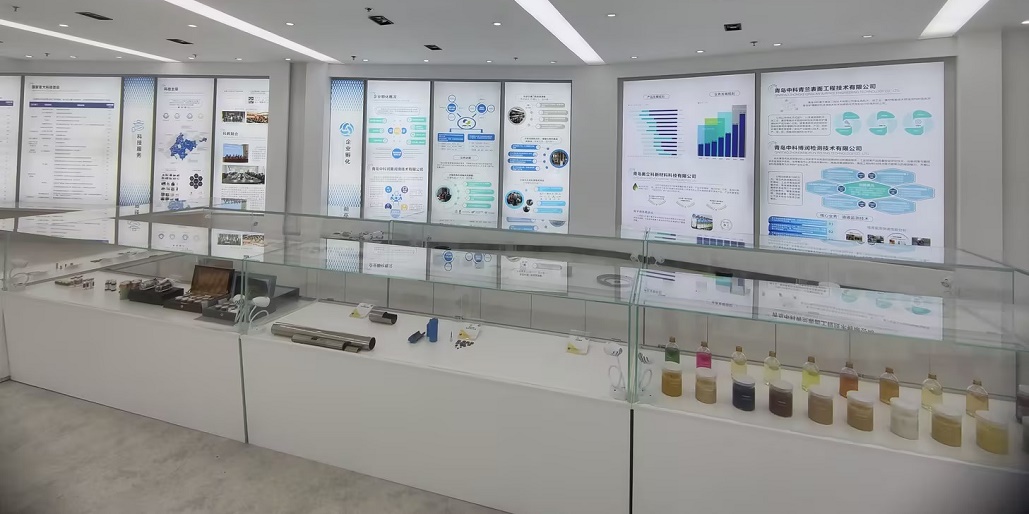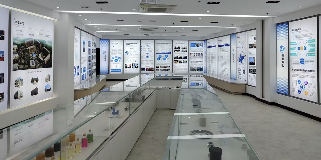 設(shè)計思路:蘭化所展館以白色為主基調(diào),輔以淺藍(lán)色點綴,營造清新、明亮的展示環(huán)境。墻面采用白色,搭配淺藍(lán)色裝飾條和展示架,凸顯蘭化所的科技感和未來感。