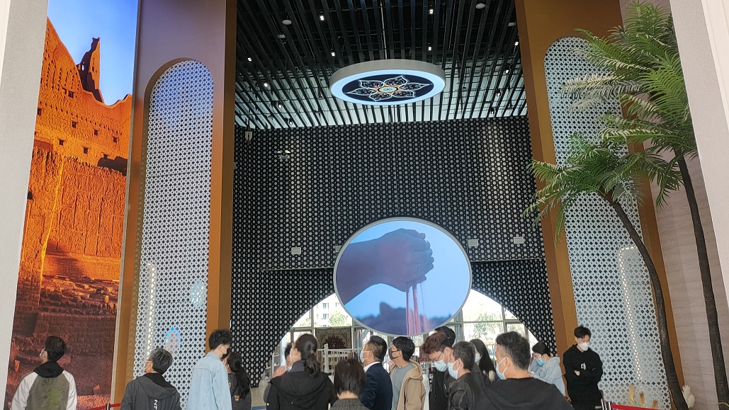 城市:山東青島,時間:2022年5月-8月。設(shè)計理念:沙特國家館布局典雅,土黃色為主調(diào),色彩絢麗,布局合理,聲光電結(jié)合,凸顯國家特色