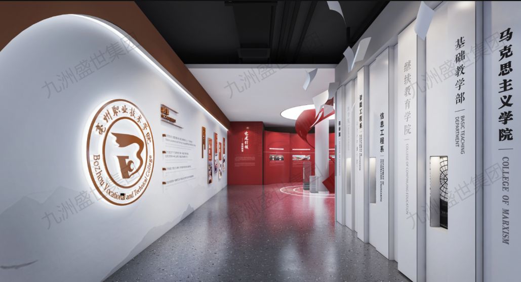 設計思路:以現(xiàn)代科技為引領,打造充滿未來感的展示空間。運用數(shù)字化、互動化等先進手段,生動呈現(xiàn)學校的發(fā)展歷程、教學成果與創(chuàng)新實踐。整體設計簡潔大氣,突顯科技魅力,讓參觀者深刻感受學院的現(xiàn)代化與前瞻性。